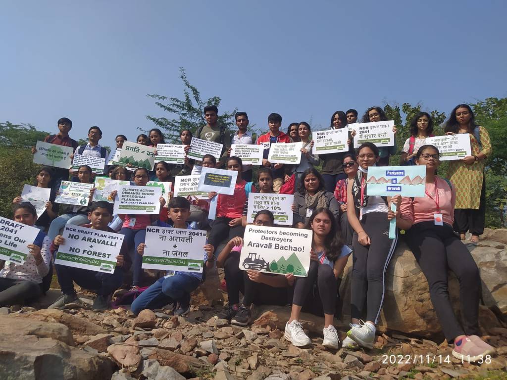 “We found no sense in having a Children’s Day party in school when many of our friends and family members are suffering badly from breathing ailments and the threat of the ill-conceived NCR Draft Regional Plan 2041 still looms strong on our heads. This plan if implemented will wipe out more than 70 percent of our precious Aravallis and other natural ecosystems like man-made water bodies, tributaries and flood plains of rivers and take away the measly 10% forest target for the 4 highly polluted NCR states. Air pollution of India’s National Capital Region will become worse if the Aravallis are destroyed as these are the green lungs, pollution sink and only barrier protecting Delhi – NCR to be swollowed by the Thar desert. Additionally, Aravallis with their natural cracks and fissures have the potential to put 2 million litres of water per hectare in the ground every year and thus act as a critical water recharge zone for the water starved Delhi, Gurugram, Faridabad, other NCR cities, Haryana, Rajasthan and Uttar Pradesh where extraction is 300% more than the recharge and ground water levels are dangerously low. Without the Aravallis, life in Delhi-NCR cannot exist and our future is doomed,” said Mitwah Nakra, a grade 12 student from Heritage Xperiential Learning School.