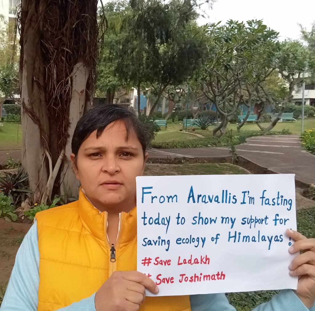 “Many members of our group ranging from 19 to 80 year olds observed the 24 hour water fast on the first and the last day of the 5 days climate fast to lend solidarity to the people of Ladakh and this sensitive ecosystem. We have recently seen the disaster of Joshimath in the mountain state of Uttarakhand unfold in front of us. Human interventions in the eco sensitive Himalayas with no respect for ecology and nature are the main culprit. We are seeing the same disastrous planning in India’s National Capital Region with ill-conceived plans such as the NCR Draft Regional Plan 2022 removing protection to the oldest mountain range in India and projects such as zoo safaris being proposed to commercialise the Aravallis,” said Anu PD from the Aravalli Bachao Citizens Movement who observed the climate fast on 2 days.