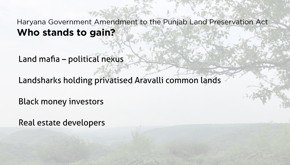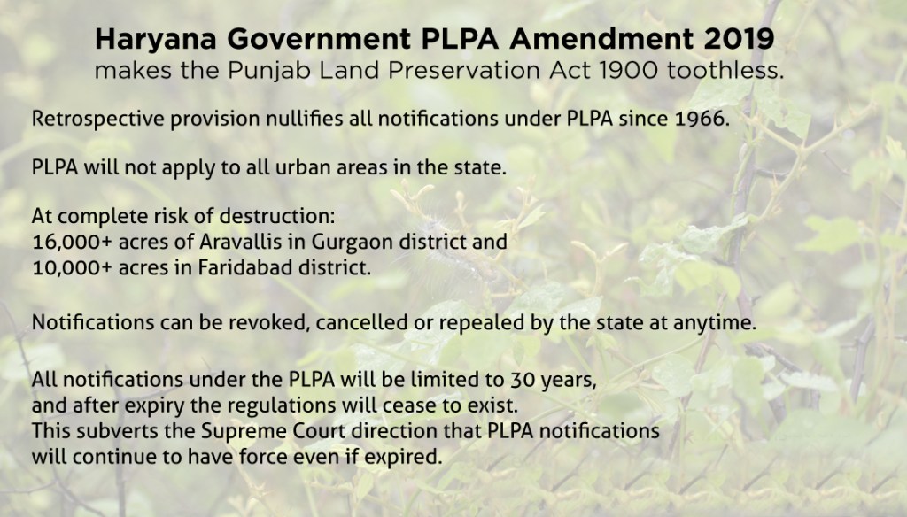 2) The implication of the amendment bill is that there will be no ‘legal’ forests left in the Aravallis of Gurgaon and Faridabad and the rest of south Haryana leading to massive forest loss and environment degradation. This government move seeks to open almost 60,000 plus acres of PLPA protected Aravalli forests to real estate and mining. Additionally, at great risk of destruction are around 50,000 acres of Aravalli forests in Haryana that do not currently have protection of the PLPA or any other forest law. This means that effectively the entire Aravalli range in South Haryana will get impacted by this government move to amend the PLPA.
